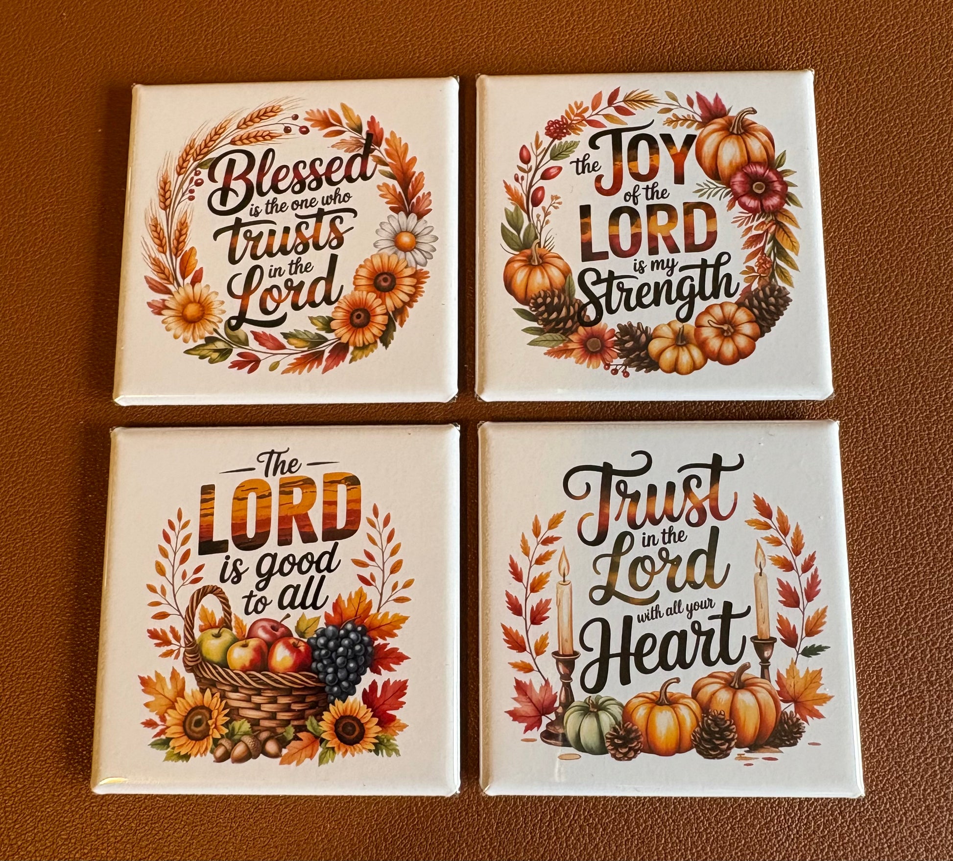 Embrace the spirit of fall with this expertly crafted set of four inspirational magnets featuring uplifting Bible verses. Perfect to decorate your home, or as a seasonal gift, each magnet serves as a gentle reminder of faith and encouragement throughout the autumn months. Designed to inspire warmth and reflection, these magnets are ideal for decorating your fridge, office, work cubicle, or any magnetic surface, bringing spiritual motivation and seasonal charm to your daily life.
